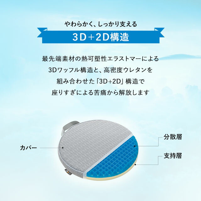 それは、忘れられない座り心地 天に向かって、自然と背筋が伸びる これは空気椅子の新しい解釈 座っていたことを忘れるような、最高の座り心地 やわらかく、しっかり支える3D+2D構造 最先端素材の熱可塑性エラストマーによる 3Dワッフル構造と、高密度ウレタンを組み合わせた「3D+2D」構造で 座りすぎによる苦痛から解放します 卵の上に座っても大丈夫3Dワッフル構造で面で支える 「3+2D」分散構造により、安定感のある座り心地で お尻に集中する体重を複数方向へ分散します 使いやすさにもこだわりを 日常の暮らしに取り入れやすくするために 機能性だけでなく、使い勝手にもこだわりました ・持ち手付きで運びやすい 付属カバーには持ち手を付けました。