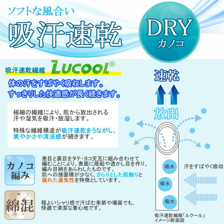 ●吸汗速乾DRY 極細の繊維により、肌から放出される汗や湿気を吸汗・放湿します。