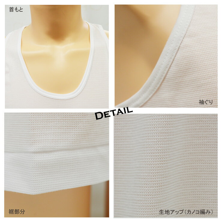 ●2枚組 ●ランニング ●カノコ編み 表目と裏目をタテ・ヨコ交互に組み合わせて編むことにより、表面に隆起や透かし目を作り、編み目柄をあらわしたものです。